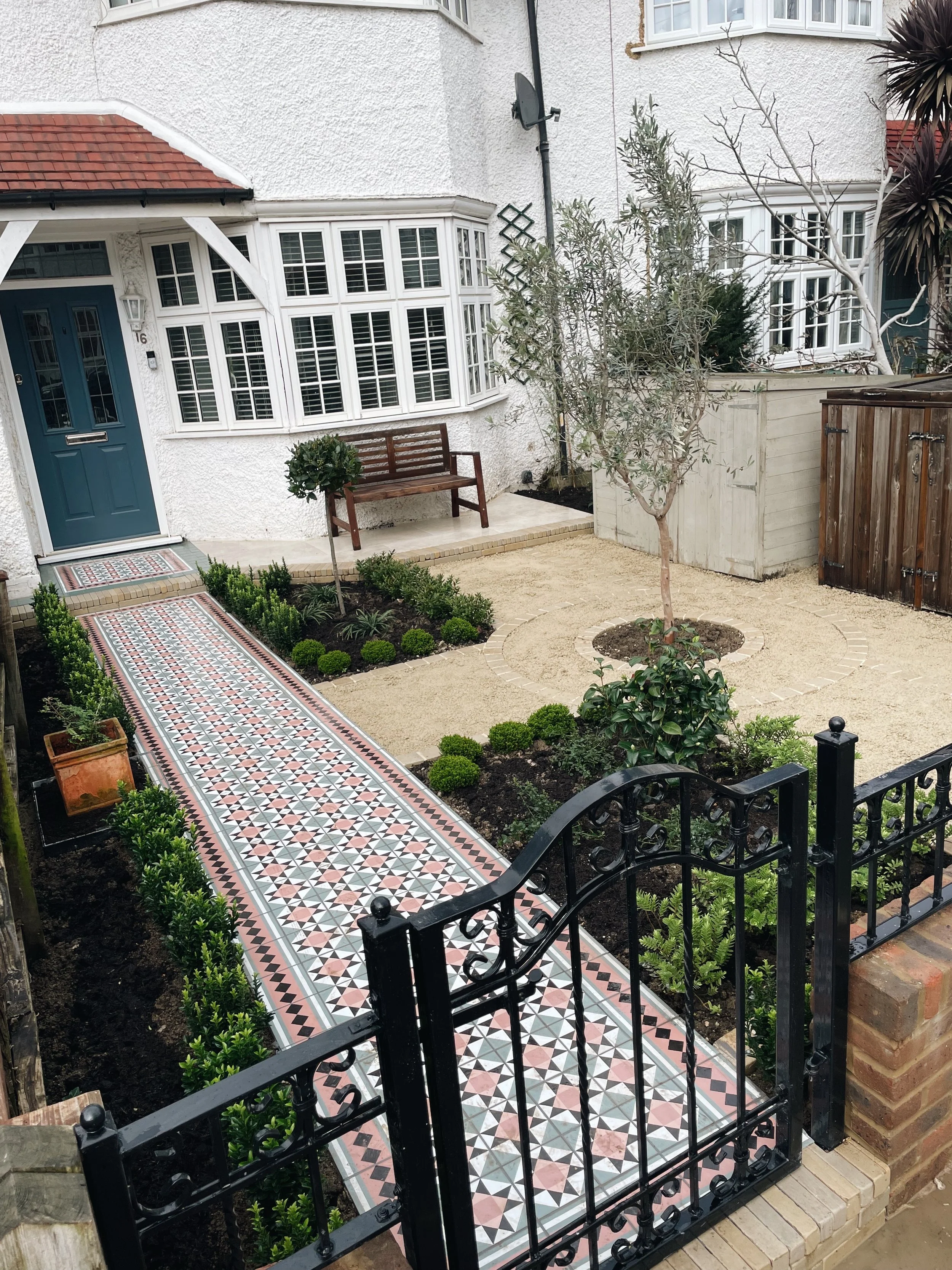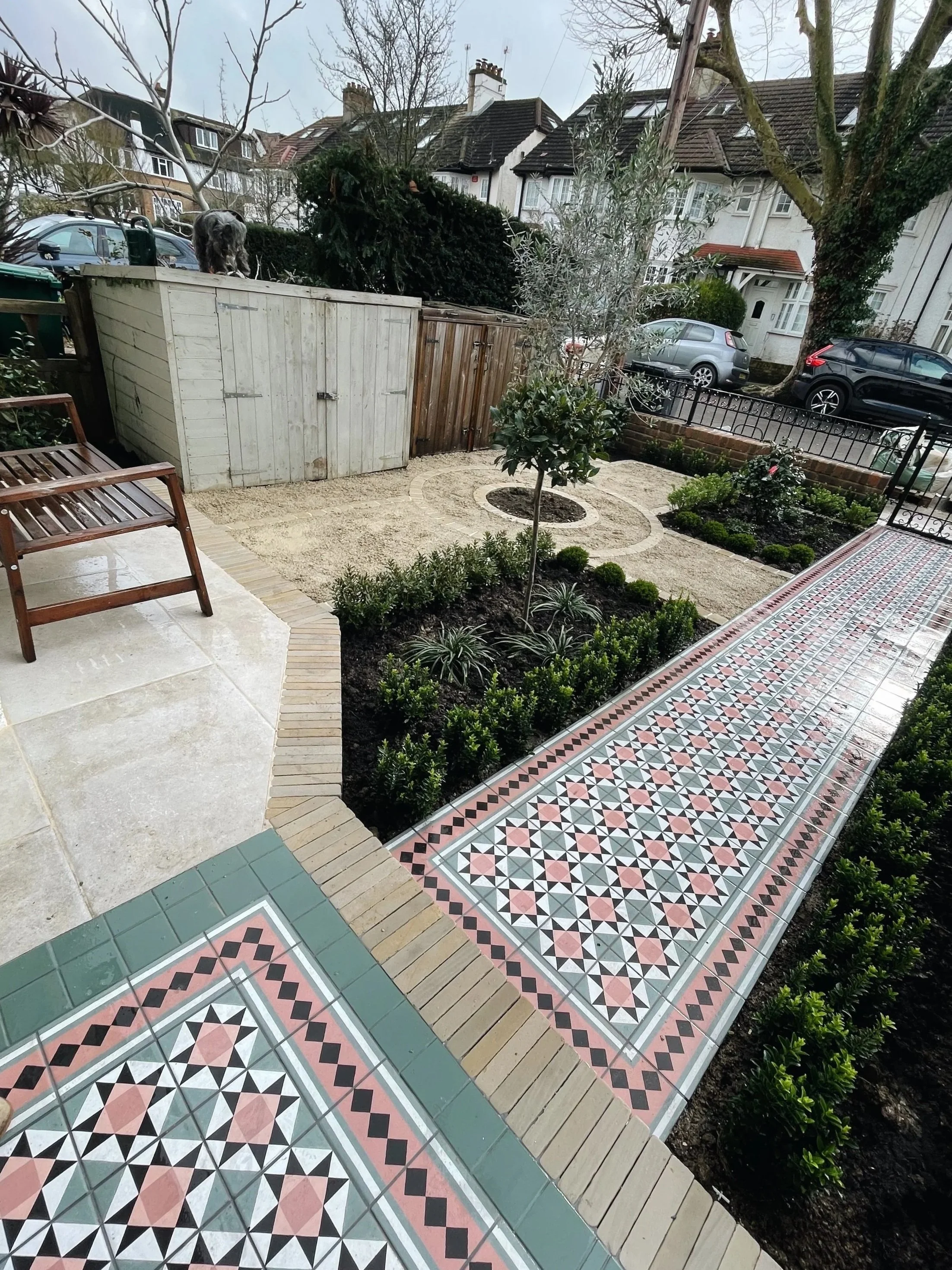 A statement Victorian-inspired geometric tiled pathway creates a striking focal point, guiding visitors through structured evergreen planting and tailored topiary. Precision brick edging frames the layout, delivering crisp lines and symmetry, hallmarks of high-end residential landscaping. Designed to maximise kerb appeal while creating a refined, welcoming entrance, this project combines timeless materials with contemporary detailing